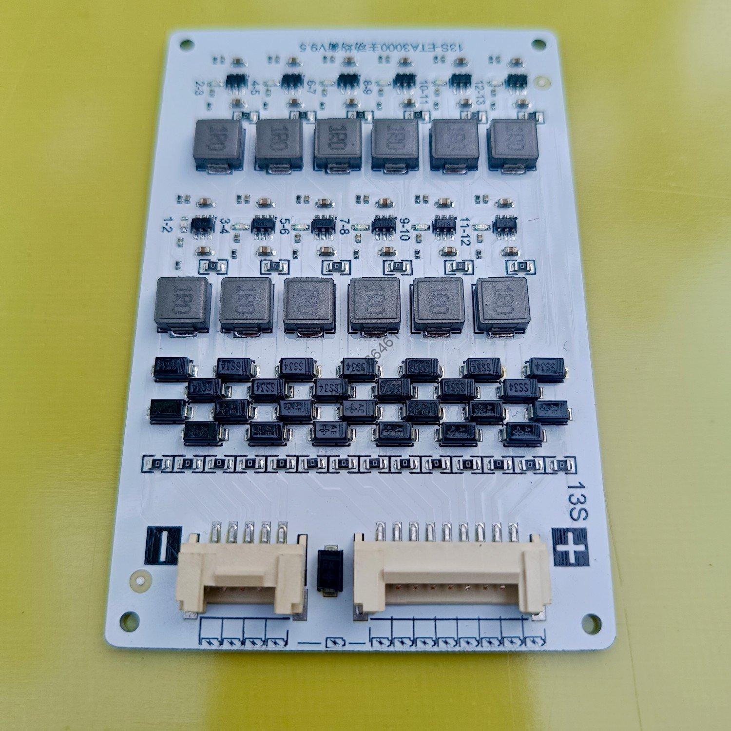 The 13S2A Active Balancer (NEEY) is a battery management solution designed for 13 series lithium-based battery packs. It supports 2A of current per cell for active balancing, which helps ensure that all cells in the battery pack are charged to the same voltage level. Active balancing optimizes battery performance by redistributing energy from higher-voltage cells to lower-voltage cells, thus improving the overall efficiency and lifespan of the battery pack. This balancer helps to prevent overcharging or deep discharging of individual cells, ensuring a safer and more reliable operation. The NEEY designation indicates the specific brand or model, offering efficient and effective cell balancing for applications such as energy storage systems, electric vehicles, and other lithium-based power solutions.